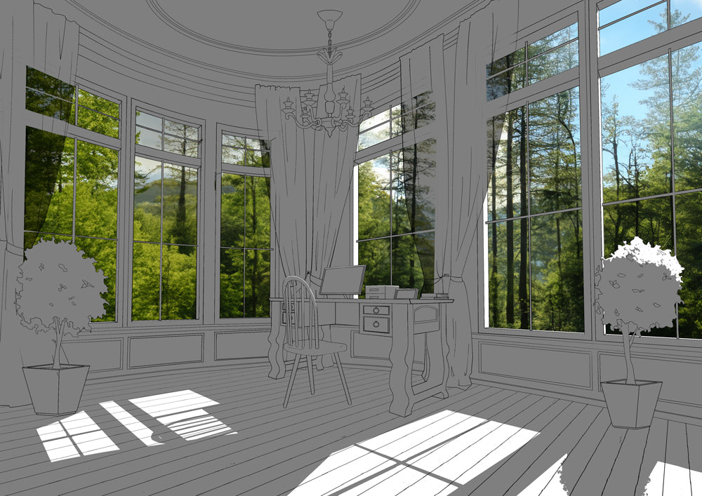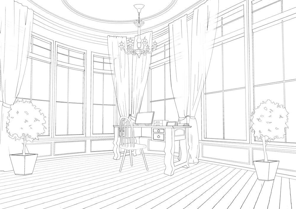 This piece invites you to immerse yourself in the tranquil haven of a second-story study room nestled within a lush forest. The heart of this scene is a minimalistic study area, adorned with just the essentials: a sturdy desk, a comfortable chair, and two plants, breathing life into the room.